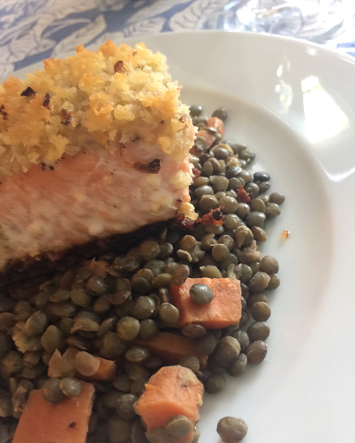 ~Panko encrusted King Salmon with French lentils, paired with a French viognier, find the recipe for both here~