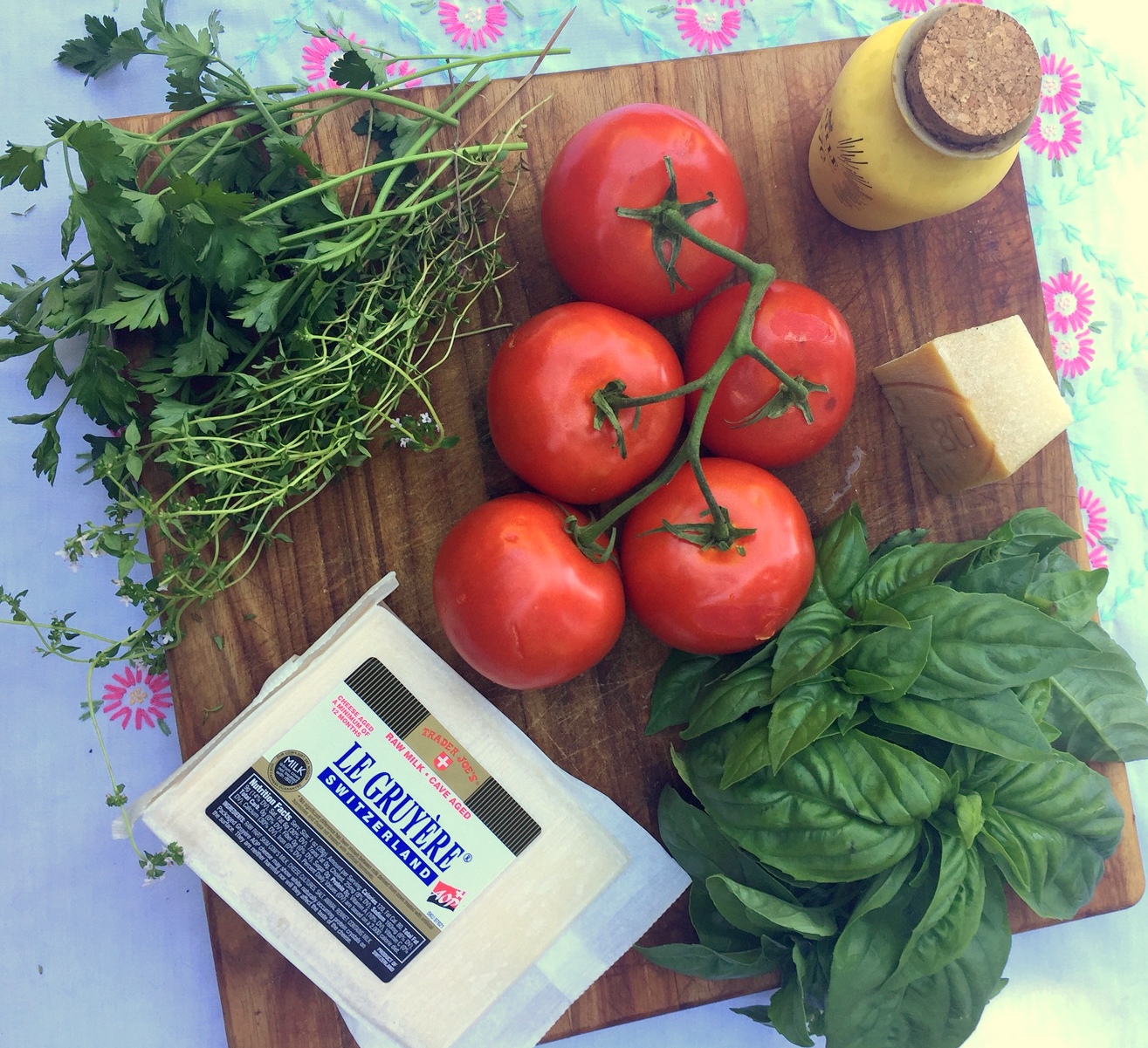Spoon any extra dressing on top of the tomatoes. Sprinkle the remaining Gruyere and Parmesan on top of the tomatoes.