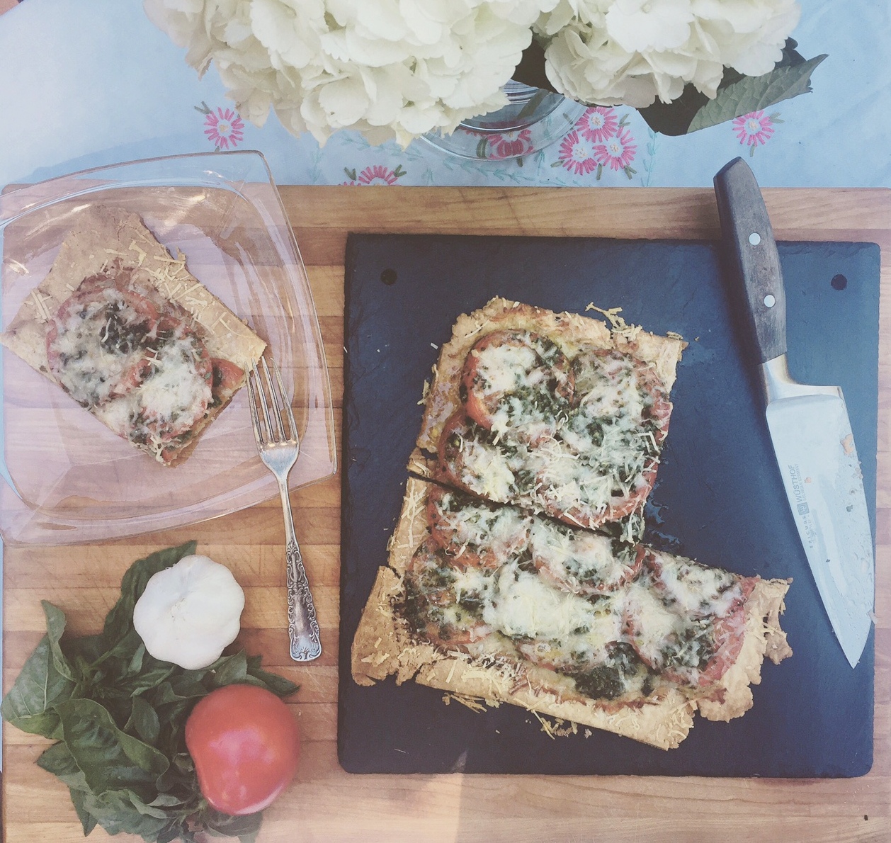 Last weekend I enjoyed making it out on my back porch under the sun, only stepping inside to use my food processor and oven. The crust is flaky, and melts in your mouth (you can also use a puff pastry picked up at your local market) and the layer of buttery cheese elevates the entire tart to decadence. Without the need for pretense with fancy tart pans, this rustic tart allows the flavors to work their magic without the fuss. Using fresh herbs from the garden, pour yourself a glass of wine, mix up a simple green salad with vinaigrette and enjoy.