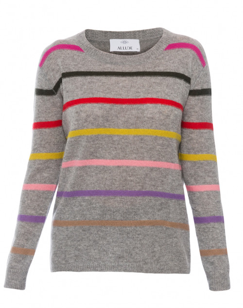 ~A lover of cashmere and stripes, the bright, playful colors are balanced well with the neutral grey hue. Ideal for layering under a warm wool coat and skinny jeans with a low-heeled bootie, stay warm and stay light-hearted.~