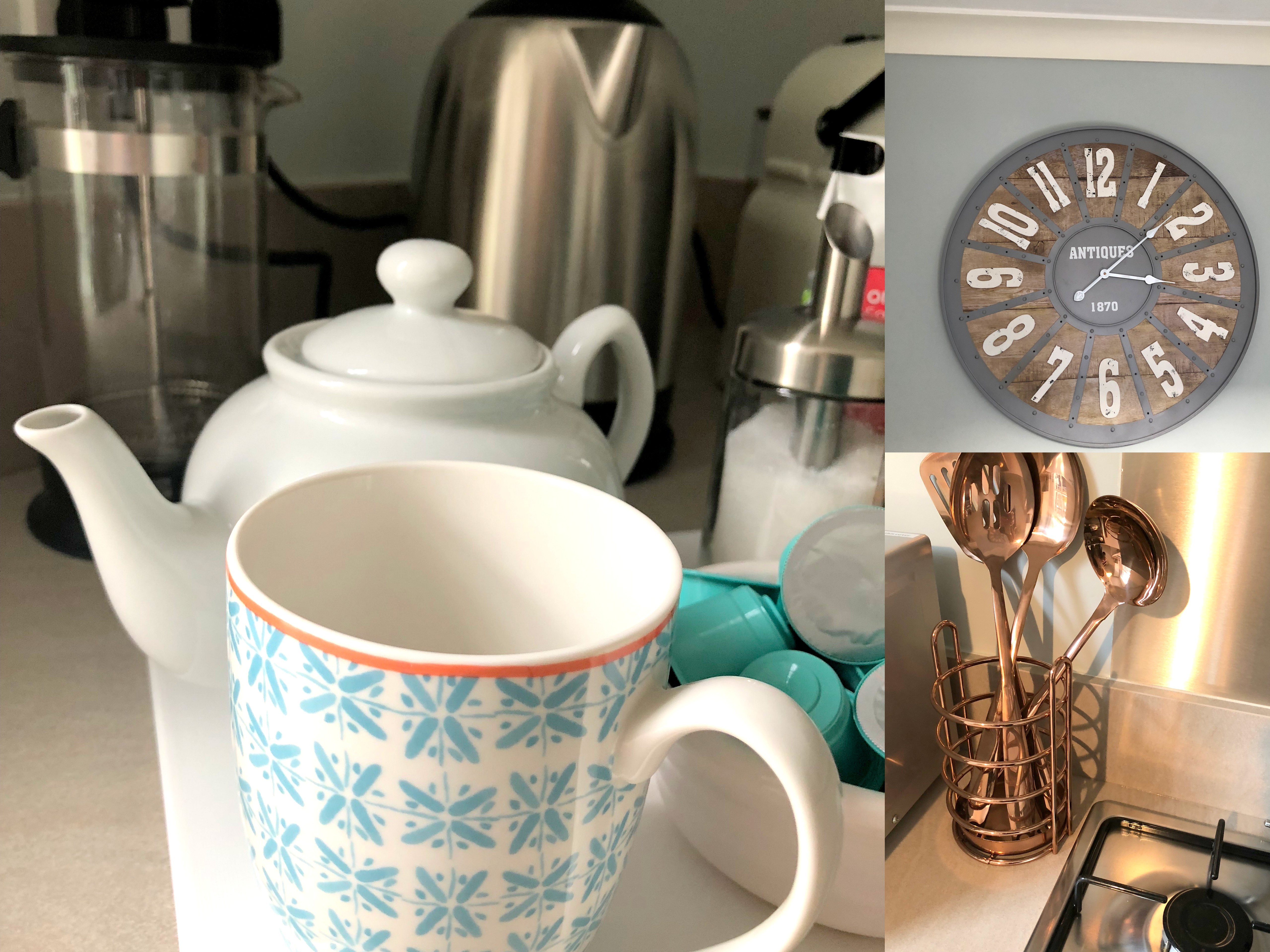 ~copper utensils and other details, a tea kettle, nespresso machine, French press, teapot, English tea and coffee~
