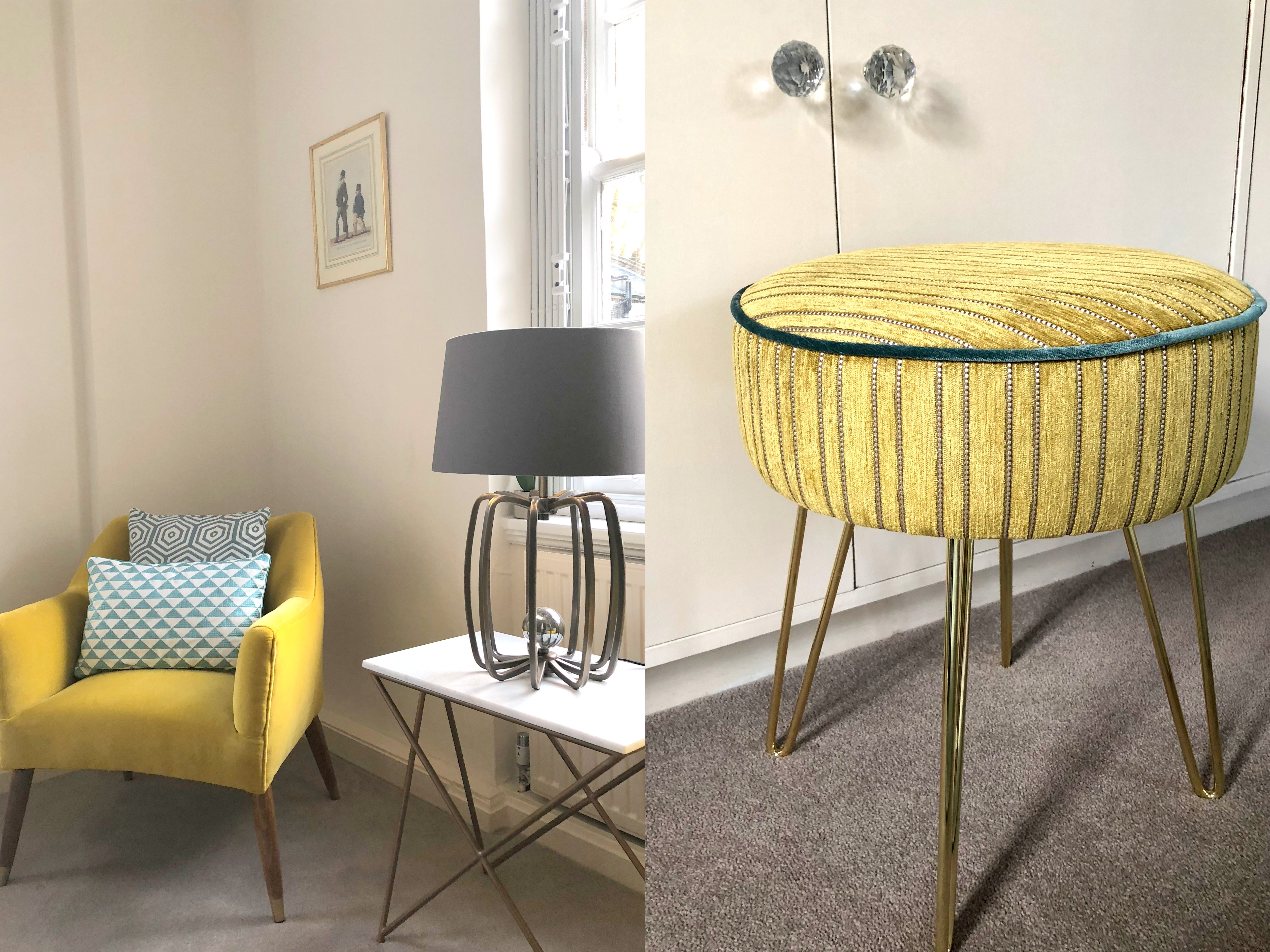 ~the footstools above were throughout the home, reupholstered to fit each room (one in the bedroom was used at the dressing table). A lovely detail that enables more comfort and more seating if necessary for guests.~