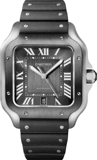 In 2020, Cartier launched the Santos de Cartier in two references, with one model in a fully steel ADLC case and the other with a steel case combined with an ADLC bezel. The former has a black dial whereas the latter, a grey dial. They come matched with a black rubber strap and black alligator strap or full steel bracelet and black rubber strap. These are easily interchangeable on each respective model and the steel bracelet version even has a ‘Smartlink’ adjustment system. Both are only available in the LM (Large Model) size. Powering the watch is a Cartier in-house automatic calibre – the 1847MC which features high anti-magnetism properties. Finally, the watch is water-resistant up to a sporty 100 metres.