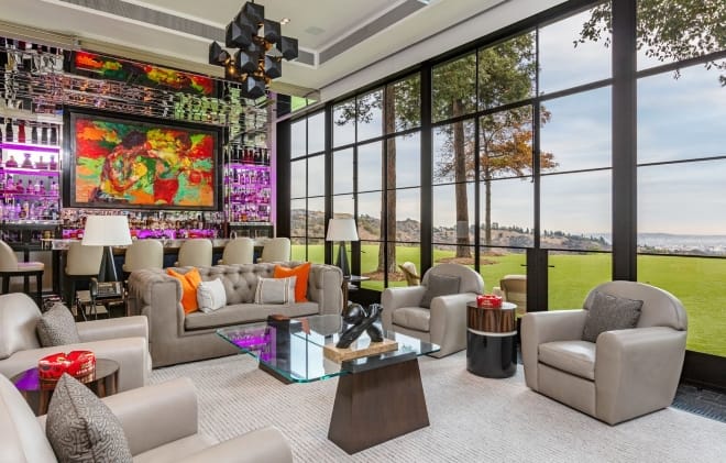 The Mediterranean-style mansion covers 21,000 square-feet and has six bedrooms, 12 bathrooms, a vast kitchen with two islands and a beautiful dining room, hand-painted to emulate an old word-style castle. The home’s den was recently refurbished with handmade floor-to-ceiling steel windows for a more modern touch. Additional amenities include a cigar room, a well-equipped gym, movie-screening room, and perhaps the most exquisite, custom bar in the neighbourhood.