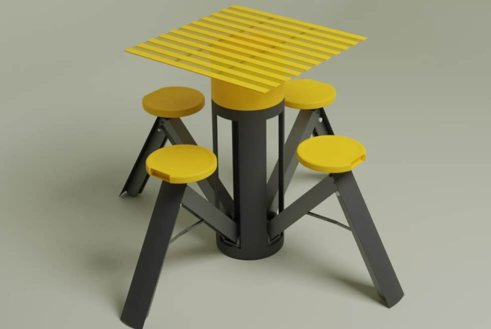 porTable holds four seats in its cylindrical volume and pull-out legs around its frame that serve as the legs for the table and the stools.