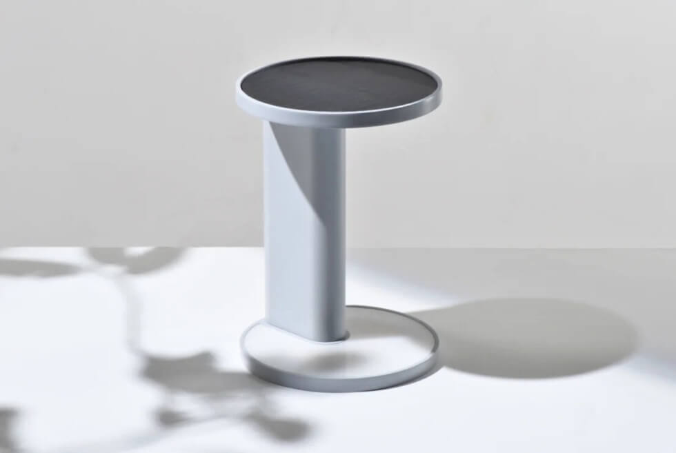 porTable holds four seats in its cylindrical volume and pull-out legs around its frame that serve as the legs for the table and the stools.