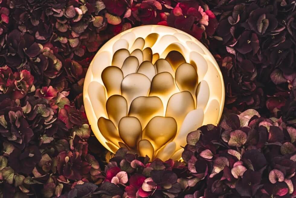 Bocci's 118p lamp appears as a glowing orb with elongated shapes in a transparent sphere formed by gravity and heat.