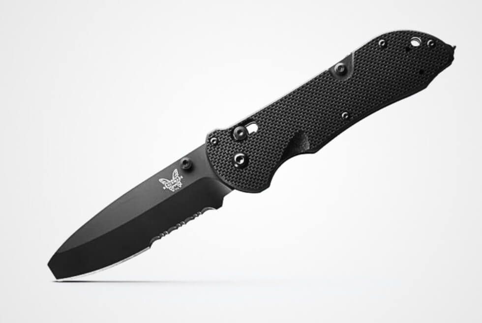 Benchmade's 916SBK-ORG Triage features a flat, blunt-tipped N680 blade, a carbide glass breaker, and a 440C stainless steel folding hook.